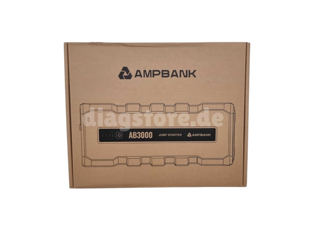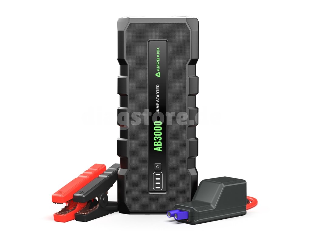- Leistungsstarker Starter – Starthilfe-Powerbank (Jump Starter) AMPBANK AB3000 hat eine Spitzenstromstärke von 3000 A und kann innerhalb weniger Sekunden fast alle 12-V-Fahrzeugmotoren (bis zu einem Hubraum von 8 l (Benzin) oder 6 l (Diesel)) starten. Er ist perfekt kompatibel mit 12-V-PKWs, LKWs, SUVs, Motorrädern, Traktoren, Rasenmähern usw.