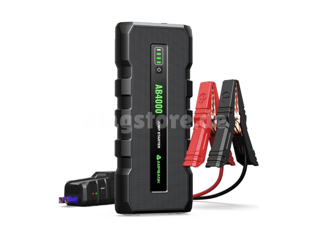 - Leistungsstarker Starter – Starthilfe-Powerbank (Jump Starter) AMPBANK AB4000 hat eine Spitzenstromstärke von 4000 A und kann innerhalb weniger Sekunden fast alle 12-V-Fahrzeugmotoren (bis zu einem Hubraum von 8 l (Benzin) oder 6 l (Diesel)) starten. Er ist perfekt kompatibel mit 12-V-PKWs, LKWs, SUVs, Motorrädern, Traktoren, Rasenmähern usw.