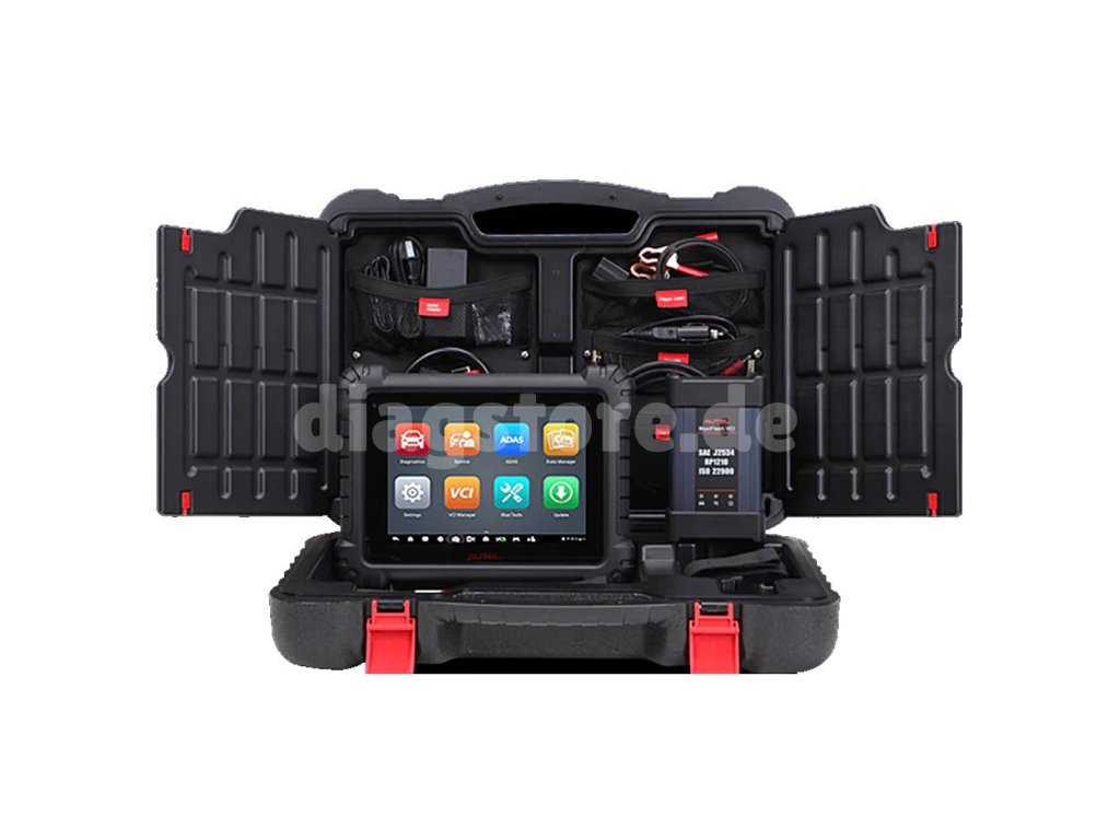 MaxiSYS MS909 bietet ähnliche Diagnosefunktionen wie das Flaggschiff-Tool MaxiSYS Ultra von Autel. Es ermöglicht die vollständige Diagnose aller Geräte der meisten europäischen, asiatischen und amerikanischen Autos, kombiniert mit fortschrittlichen Servicefunktionen. Das Gerät kann Fehlercodes in allen Geräten lesen und löschen, Live-Daten anzeigen und aktive Tests durchführen. Es kann außerdem den Bereitschafts-Code lesen, Serviceintervalle zurücksetzen, DPF diagnostizieren und regenerieren, grundlegende Drosselklappeneinstellungen vornehmen, Anpassungen des Automatikgetriebes zurücksetzen, grundlegende TPMS-Diagnosen durchführen, die Batterie registrieren und codieren, Einspritzdüsen codieren, Schlüssel und Fernbedienungen codieren und viele weitere Aufgaben ausführen. Flashing von Geräten, Codierung und Anpassung sowie Online-Codierung und -Anpassung wird ebenfalls unterstützt. Die Freischaltung versteckter Fahrzeugfunktionen und die Topologie der Geräte (Mapping) sind ebenfalls enthalten. Unterstützung der deutschen Sprache.