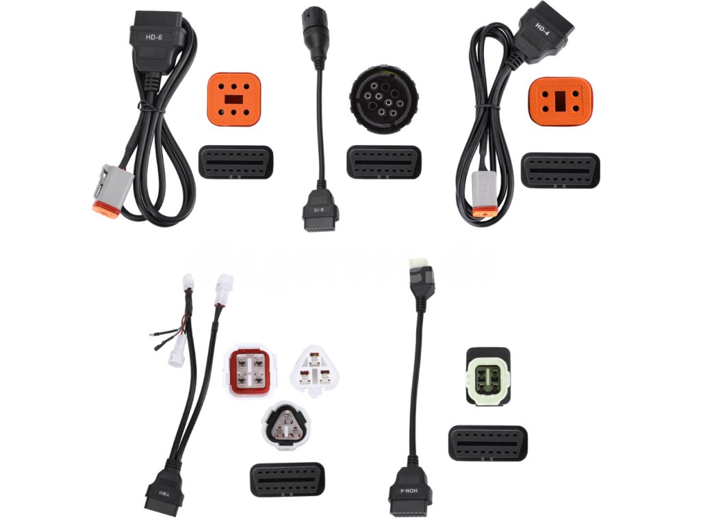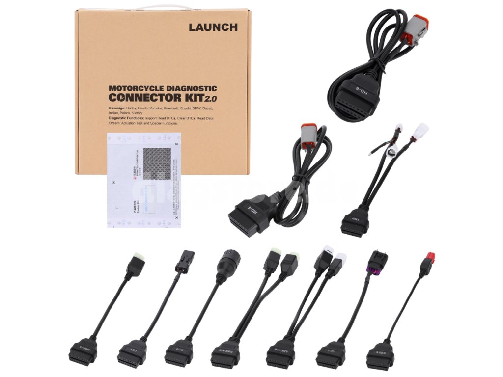 Set mit OBD-II-Adaptern und Softwarelizenz für die Diagnose von Motorrädern mit Launch-Geräten. Die Launch-Diagnosegeräte eignen sich für Motorräder der Marken Harley Davidson, Yamaha, Honda, Suzuki, BMW, Kawasaki, Indian, Polaris, Victory, Ducati und andere. Das Produkt ist nicht separat verwendbar, die Adapter und die Lizenz müssen mit einem geeigneten Diagnosegerät kombiniert werden.